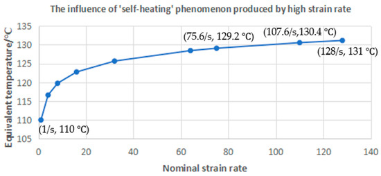 As shown in Figure 14, the difference in the maximum strain rate is most obvious when the oil bath temperature is 110 °C; so, the ‘110 °C scenario’ is also adopted in the current work as an example. Yan [4] proposed a concept called ‘equivalent temperature’ in his previous research which is able to quantitatively transfer the influence produced by a high strain rate to the effects provided by temperature. As shown in Figure 15, according to Yan’s empirical equation, the behavior of PET (strain–stress curve) stretched at a nominal strain rate of 128/s and at 110 °C is similar to the behavior of PET (strain–stress curve) stretched at a nominal strain rate of 1/s and at 131 °C. It can therefore be observed that the influence of strain rate on PET decreases with the increase in strain rate. The equivalent temperatures for strain rates of 75.6/s and 107.6/s are 129.2 °C and 130.4 °C—a small difference with little impact on stress strain behaviour and hence can be ignored. As result, compared with the biaxial stretching experiments, the strain rate is not as important in the SBM process since it mainly operates in the high-strain-rate range even when the ‘flow index’ is et to 2. As a result, the influence of strain is removed from the main ANN ( ‘ANN_Temperature’).
