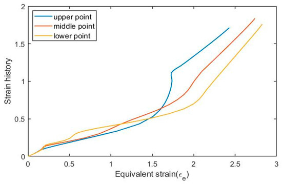 The prediction by the ANN whilst good still has some limitations; for example, in Figure 19, the prediction for the lower point on the preform displays a fluctuation in the stress–strain curve rather than a smooth monotonic stress–strain curve observed experimentally. This is likely a result of the overfitting phenomenon that can be typically found when training ANNs. Although lots of methods have already opted to decrease the level of oscillations in ‘ANN_Temperature’ and ‘ANN_Strain history separately, for example,’ANN_Strain history’ has already been designed as a kind of dynamic model, the oscillation level of the output of the ANN-based constitutive model is still slightly larger than the corresponding oscillation level in a single ANN due to the relationship between the outputs of these two ANNs (they need to be multiplied by each other). It is unclear at present what influence this will have on the free stretch blow simulations but it can likely be minimized through further optimization.