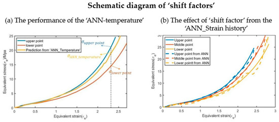 The combination of ‘ANN_Temperature’ and ‘ANN_Strain history’ may increase the oscillation level of the ANN model’s output. However, it significantly enhances the model’s stability under conditions beyond the training range or with extreme strain histories compared to a single ANN model. As depicted in Figure 13, the input variables for ‘ANN_temperature’ encompass ‘stretch_axial’, ‘stretch_hoop’, and temperature. A comprehensive database comprising these variables can be readily obtained through planar tensile testing. Consequently, the likelihood of the input data for ‘ANN_Temperature’ exceeding the training set during the stretch blow molding process is minimal. The input of ‘ANN_Strain history’ includes ‘strain history’, which may cause its input data to exceed the training set. However, as illustrated in Figure 20, the output of ‘ANN_Strain history’ functions as a shift factor to fine-tune the results of ‘ANN_temperature’. Therefore, when the input strain history of ‘ANN_Strain history’ exceeds the training set, its output can be confined within a rational and relatively small range. According to experimental data, this range is [0.76, 1.78] in this study. In conclusion, the current structure ensures the stability of ‘ANN_Temperature’ and its substantial contribution to the final output values. ‘ANN_Strain history’ is designed to improve the accuracy of the output from ‘ANN_Temperature’, but it may encounter data exceeding the training set. When such a situation arises, the role of ‘ANN_Strain history’ is restricted. A strategy that sacrifices a certain degree of accuracy is adopted to maintain overall stability.