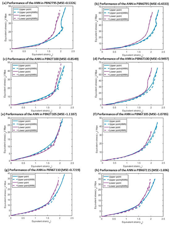 As mentioned above, the experimental data of P8N2T110 and P8N2T115 have been removed from the training database. Therefore, test conditions of P8N2T110 and P8N2T115 are used to validate the performance of the hybrid ANN-based constitutive model in Abaqus/Explicit in the current section.