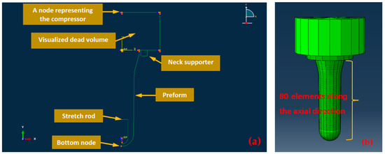 The detailed FE model used for the free stretch blow simulation. (a) The annotated CAE interface to illustrate the model of the free stretch blow process in ABAQUS/Explicit; (b) the FE preform model with 80 SAX1 elements.
