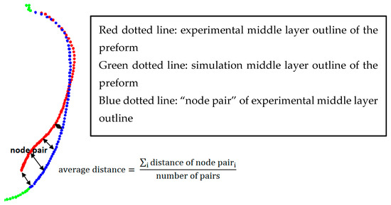 The hybrid ANN-based constitutive model in the current paper is developed for simulating the SBM process specifically. Compared with the strain–stress curves of PET at some specific positions, it is also important to quantify the accuracy of the final geometry of the preform predicted by the hybrid ANN constitutive model during the free blow experiments since it has a direct relationship with the final product of the SBM process. In order to quantitatively compare these preforms’ geometries predicted by the Buckley model and the hybrid ANN model in the following section, a concept called ‘average nodal distance’ was proposed. A schematic diagram and calculation equation are shown in Figure 23. As shown in Figure 23, the middle layer outline of the preform collected from the experiment is represented by the red dotted line, while the corresponding simulation result is shown by the green dotted lines. Figure 3c indicates the relative positional relationship between high-speed cameras and the preform during experiments. These two cameras were placed horizontally at the middle of the preforms during the experiments so they could not capture the evolution of strain for these positions located at the top and bottom of the preforms due to the viewing angle. This is the reason why the middle layer outline (red solid line) is missing at the bottom of Figure 23. In other words, the ‘strain’ variable for some nodes in the simulation model does not have corresponding experimental data. These nodes which have experimental ‘strain’ data collected by these two high-speed cameras are shown by the blue dotted line in Figure 23. The two nodes which share the same position in the simulation model and the preform sample at the beginning of the free stretch blow process are called one ‘node pair.’ The variable ‘average distance’ is obtained from each ‘node pair’.