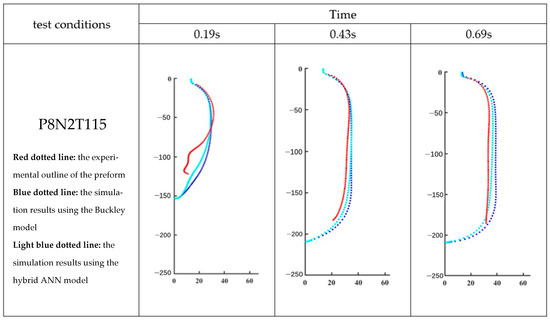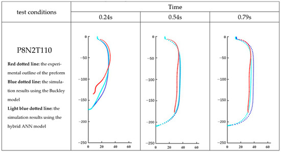 According to Section 4, the hybrid ANN-based model is developed from the Buckley model. Therefore, the evolution of the preform as predicted by the hybrid ANN-based constitutive model and the Buckley model developed by Yan [4] at different time moments is shown in Figure 24 and Figure 25, respectively. MATLAB is used to plot these geometries by using coordinate data of all elements which are exported from Abaqus/Explicit. The outline of the preform captured by the DIC analysis during the free stretch blow experiment is represented by the red dotted line, while the simulation results by the Buckley model and the hybrid ANN-based model are shown, respectively, by the blue and light blue dotted lines.