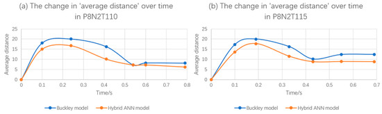 ‘Average distance’ comparison between the Buckley model and the hybrid ANN model for (a) P8N2T110 and (b) P8N2T115.