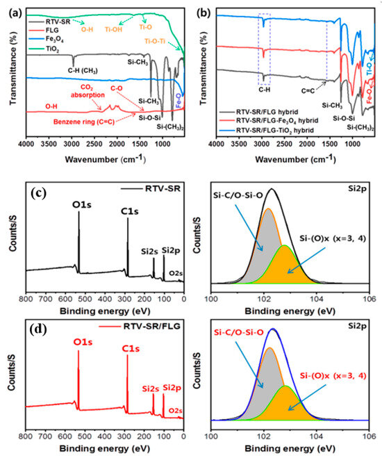 (a,b) FTIR of carbon nanomaterials and their composites. FTIR of silicone rubber shows functional groups like C-H, Si-CH3, Si-O-Si; FTIR of FLG shows functional groups like O-H, C=C, C-O and adsorption of CO2; FTIR of iron oxide shows functionalities like Fe-O; FTIR of TiO2 shows functional groups like O-H, Ti-OH, Ti-O, and Ti-O-Ti; finally, FTIR of composite sample shows functionalities like C-H, C=C, Si-CH3, Si-O-Si; (c,d) XPS of unfilled and graphene-filled silicone rubber compote samples. Results reveal that silicone rubber contains Si-O-Si and Si-C bonds, indicating silicone polymer networks. Deconvolution results show interactions between graphene and silicone rubber. These interactions can be physical adsorptions or chemical bonding, such as Si-O-Si linkages Reproduced from open access article [76].