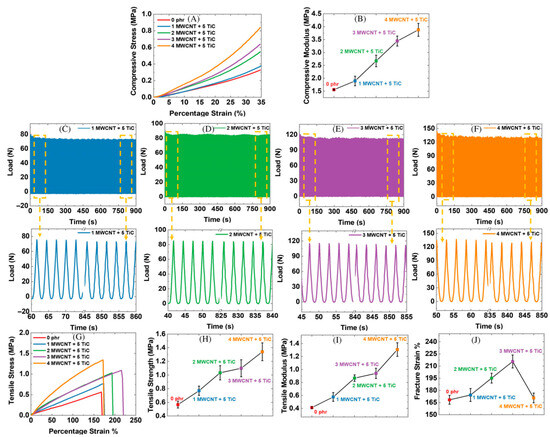 Similarly, the compressive modulus in Figure 3B increases with increasing MWCNT content, reaching a maximum at 4 phr MWCNT + 5 phr TiC sample. This can be influenced by a higher “reinforcing effect” of MWCNT in the composite. Moreover, the higher modulus is due to efficient and robust interfacial interactions in the composites [96]. Finally, the high properties are due to optimum fabrication methodology, dispersion, orientation, and high aspect ratio of MWCNT [97]. These factors strongly influence the improved compressive modulus with increasing MWCNT content in composites. These aspects are important for achieving high performance for physical activity monitoring sensors for mechanical stability and durability [98,99]. Among the various main mechanical factors, mechanical stability is critical for physical activity monitoring sensors. Thus, Figure 3C–F shows the mechanical stability under compressive cycling for different composites. The results reported by Manikkavel et al. [91] show that under continuous compressive cyclic strain, the output mechanical load was stable with negligible losses from the initial to final cycles. This behavior supports their use of physical activity monitoring sensors [100]. These sensors require higher mechanical stability and critical fatigue resistance against mechanical failure. This can be correlated to better load transfer, thereby making the composite more resistant to mechanical deformation [101]. Moreover, the desired modulus and sensitivity can obtain better performance for physical activity monitoring sensors.