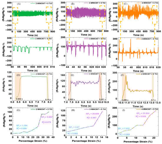 Considering these aspects, Park et al. [91] fabricated composites by adding different propositions of MWCNT and fixed 5 phr of TiC into silicone rubber. Finally, these composites were studied for their use in strain sensing by reporting resistance change, response time, and gauge factors [114]. Figure 4A–C report the resistance change by increasing the MWCNT content in the SR matrix. The piezoresistive effect can be understood by composites based on SR matrix and MWCNT and TiC. This helps in achieving higher change in electrical resistance in response to mechanical strain [115]. This can be understood in more detail as the formation of electrically conductive pathways in composite by MWCNT and TiC into SR matrix. Thus, as the composite undergoes compressive mechanical deformation, there is a change in resistance [116]. Finally, it results in enhancing the piezoresistive effect and amplifying the change in resistance for a given level of strain. Another mechanism for achieving higher piezoresistivity is related to filler percolation phenomena [117]. For example, increasing the MWCNT content beyond the threshold helps the composite material transition to a more conductive state. Finally, this assists in making the composite more sensitive to changes in strain-induced resistance [118]. Moreover, the with change in resistance, the sensitivity of the composite can be adjusted by changing the content of MWCNT in the SR matrix. This can be adjusted by tuning MWCNT content for desirable performance. This tuning allows for optimization factors like sensitivity, linearity, and mechanical properties of the final composite [119,120]. Overall, the mechanical stability is important in affecting the fatigue and durability properties of these composites. For example, the mechanical stability of these composites helps to withstand mechanical strain without failure, ensuring reliable performance as a strain sensor over extended usage [121].