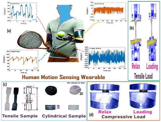 Figure 5a shows the outline of the wearable sensor in the human body. The real-time sensing responses can be performed under thumb pressing, finger pressing, finger bending, and wrist bending [137]. For strain sensors utilizing composite materials, those used in wearable devices can induce varying responses in terms of resistance change [138,139]. Figure 5b shows the relaxation and loading under tensile strain from a universal testing machine. These strain types can be understood more extensively as thumb or finger pressing states, as when pressure is applied with the thumb, it results in localized compression on the sensor surface. This compression can result in a decrease in resistance change, thereby increasing conductive pathways in composite elements [140]. Then, the finger bending or wrist bending results in inducing complex strain on the sensor surface. The dimensions of cylindrical and dumbbell samples are presented in Figure 5c. Finally, Figure 5d shows relaxation and loading under compressive strain. Generally, the bending process results in variable compressive or tensile strain across the sensor, resulting in varied response in resistance.
