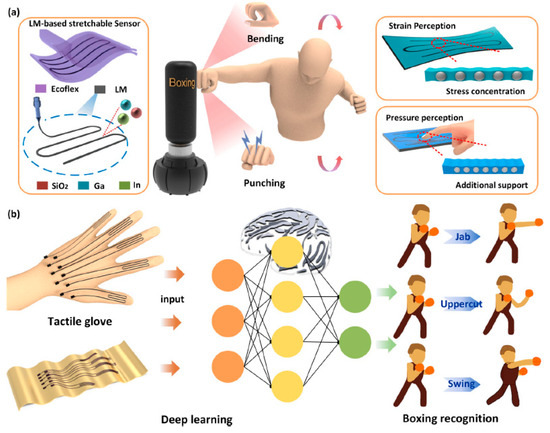 - Qiu, Y.; Zou, Z.; Zou, Z.; Setiawan, N.K.; Dikshit, K.V.; Whiting, G.; Yang, F.; Zhang, W.; Lu, J.; Zhong, B.; et al. Deep-learning-assisted printed liquid metal sensory system for wearable applications and boxing training. npj Flex. Electron. 2023, 7, 37. [Google Scholar] [CrossRef]