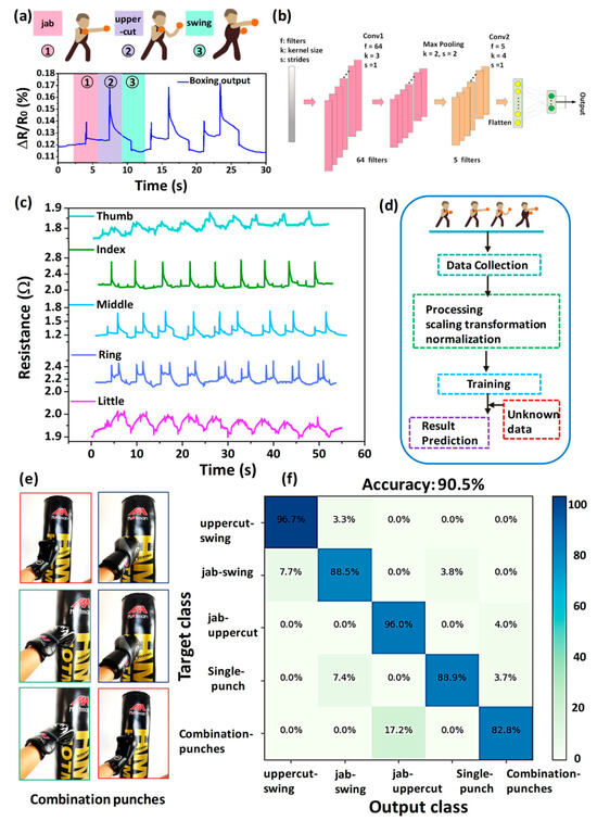 It is well known that the resistance changes sensors often rely on piezoresistive mechanisms. For example, under mechanical motions of bending or pressing, the electrical resistance changes proportionally depending upon the magnitude of mechanical stimuli [156]. This change in resistance can be measured and correlated with specific human motions like finger pressing or bending during boxing [149]. The wearable sensors embedded in gloves can detect changes in resistance corresponding to repetitive motions like jabs, uppercuts, or swings in boxing. Figure 7d shows the signal processing steps that include data collection. The collected data can be transmitted through the wireless platform, processing scaling transformation of data, and final validation of the results. Finally, Figure 7e shows the optical image of real-time boxing, and Figure 7f shows the confusion map of the classified results. By capturing and quantifying changes in resistance, these sensors can provide valuable insights into movement patterns and sports activities like boxing. Moreover, the change in resistance is the fundamental principle of motion sensing [157]. It, therefore, allows for the detection, quantification, and interpretation of various sports activities like boxing.