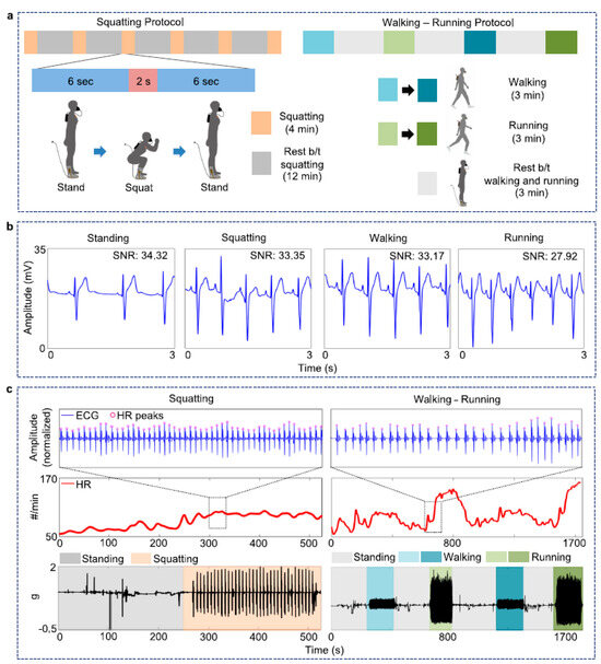 (a) Squatting, walking and running protocols. Respective data, like electro-cardio graphs (ECG) obtained through these sensors from physical activities, can be collected by involving algorithms. These algorithms analyze sensor data to recognize and quantify specific movements. (b) Output of ECG from different human motions. (c) Total protocols of one set of the activities involved. Normalized ECG peaks provide respective respiration rate from protocols. Final results evaluate mechanical stability of sensor during real-time monitoring with reduced noise and remarkable ECG signal quality. Reproduced with permission from open access article [161].