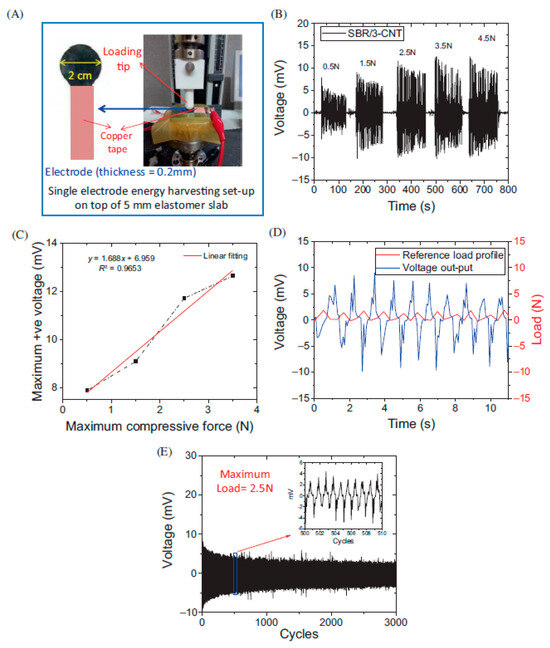 (A) Optical image of set-up. Loading tip was around 2 cm in diameter, and copper electrodes were attached to the flexible electrode for collecting the output voltage through a multimeter. (B,C) Output voltage under different forces. These reported results show that output voltage keeps increasing with increasing mechanical force up to 3.5 N before lowering down at 4.5 N force. (D) Output voltage under cyclic loading. (E) Durability examinations at a load of 2.5 N. Voltage was stable during the initial cycles but started to degrade after 500 cycles. This degradation is due to crack formation in the electrode and at filler–rubber interface failure. Reproduced with permission from Wiley [132].