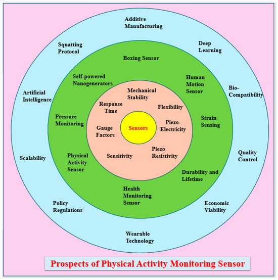The physical activity monitoring sensors are a hot research topic due to their ability to track and measure various physical activities. These physical activities are running, cycling, or swimming in living beings [1,2]. These sensors have various gadgets like temperature sensors, global positioning systems (GPS), or strain gauges. Here, the temperature sensors provide insights about external weather conditions during sports activity. The GPS sensors use satellite signals to obtain geographical locations [3]. They are often used to track remote outdoor sports activities during hiking or cycling. Moreover, the strain gauges assist in measuring the change in strain or mechanical deformation of wearable and flexible materials. For example, smart clothing monitoring or intense sports activity [4,5]. In some cases, the biosensors are helpful in studying the electric impedance of biological systems. These systems can provide sweating, hydration levels, and muscle fatigue or injuries during sporting. Finally, the pressure sensors help to measure the change in air pressure during hiking or other change in altitude during climbing [6]. Therefore, these composite based sensors can be useful by configuring various monitoring activities that test fitness goals, and other optimized training routines [7].