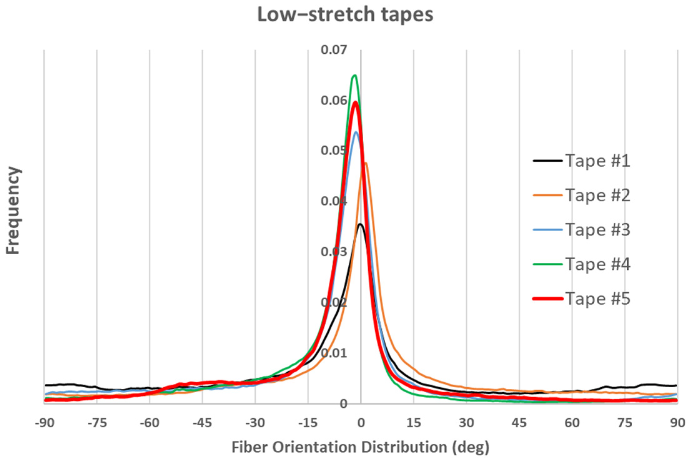 As discussed in previous sections, using accurate fiber orientation distribution analysis, carbon staple fiber tapes—despite the use of state-of-the-art alignment techniques—exhibit fiber orientation distributions with particular features. Notably, the fiber orientation distribution does not have its maximum value at 0 degrees, meaning that the majority of fibers are oriented at an angle to the axial direction. Furthermore, fiber orientations are not symmetric with respect to 0 degrees or their maximum value. This asymmetry implies that under a unidirectional axial load, coupled in-plane and shear deformation can be expected.