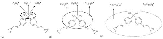 Model fragmentation of the primary ion and examples of the resulting secondary ions on DGEBA molecule for the (a) violent fragmentation region, (b) low energy fragmentation region, (c) structural fragmentation region.