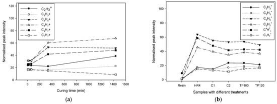Considering the observations from Figure 5 and their relation to crosslinking density, the ions C3H5+, C4H7+, and C3H7+ exhibit the most notable trends. Initially, the intensity of these molecules increases with the curing reaction up to 24 h, indicating that their concentrations rise as the curing progresses. However, this intensity tends to decrease during further curing and post-curing stages. This decrease in intensity suggests a reduction in their concentrations, which could be associated with changes in cross-linking density.