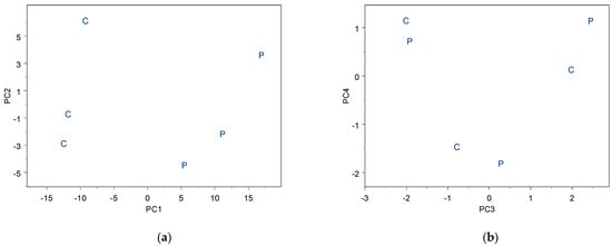 PCA was conducted using a combination of custom-developed scripts and the statistical functions provided in the Stats package (v2.5.1) within the R environment for statistical computing and graphical analysis (R version 4.3.0). The implementation follows the covariance-based algorithm described in detail by Martens and Næs [25]. Specifically, the covariance matrix was computed from the mean-centered data matrix, and its eigenvalues were extracted and sorted in descending order to reflect the proportion of variance captured by each corresponding eigenvector. These eigenvectors, calculated from the covariance matrix and eigenvalues, represent the new orthogonal basis vectors, i.e., the principal components that capture the structure of variance within the dataset. The sorted eigenvalues provide a quantitative measure of the variance each component explains, allowing us to distinguish the most informative dimensions.