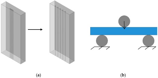 To investigate the optimal parameters for reinforcement, a numerical analysis of rectangular samples under three-point bending was conducted (see Figure 1a).