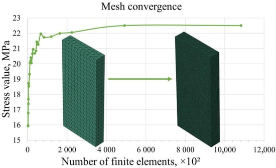 Based on the calculation results, it was found that, within the range of finite element sizes from 0.3 mm to 0.2 mm, the convergence graph approached an asymptote. Further changes to the mesh parameters were not advisable, as they may significantly increase computational time. In the models with reinforcement, the mesh was refined around the rods (with the mean size of 0.1 mm).