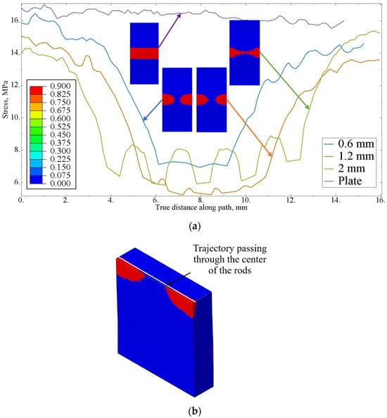 The stress distribution curves in the reinforcement zone were plotted along a path that passes through the center of the rods in the central cross-section of the sample (as shown in Figure 3b). For comparison, a curve representing the trajectory of the rod placement for the plate without reinforcing elements is also included.