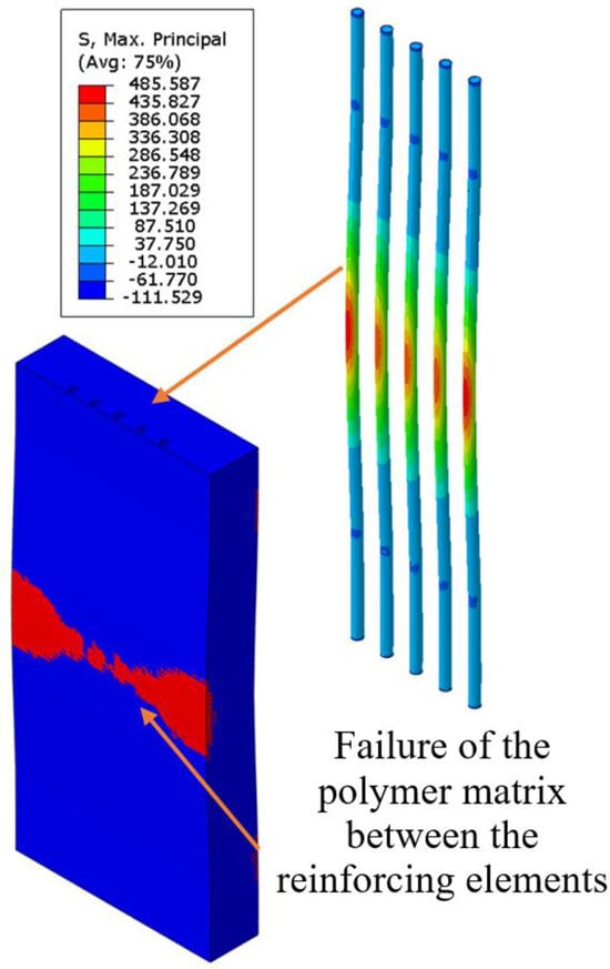An analysis of the stress distribution showed that maximum stress occurred in the unreinforced polymer material and exceeded the material’s strength limit. The sharp stress gradient on the diagrams corresponded to the arrangement of the rods in the polymer matrix. The reinforcing elements were bearing the primary load, significantly enhancing the strength properties of the plate. However, as the distance between the rods increased, the effectiveness of the reinforcing elements decreased. The strength limit of the rods has not been reached; however, cracks may initiate in the polymer matrix between the reinforcement rods (see Figure 4).