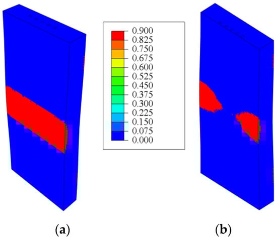 Fields of the failure criterion: (a) rods are positioned at the center of the plate, (b) rods are positioned at a distance of 0.5 mm from the outer surface of the plate to the center of the rods.