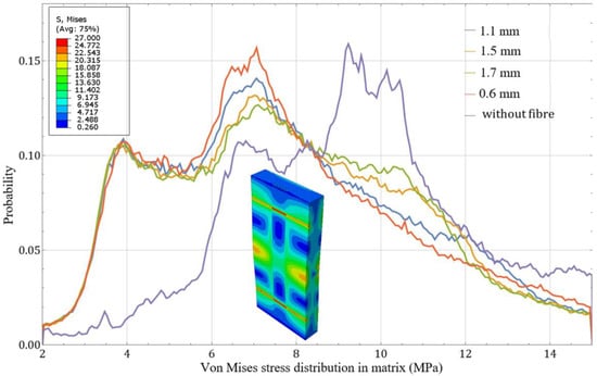 Smoothed histograms for von Mises stress distribution density in the polymer matrix.