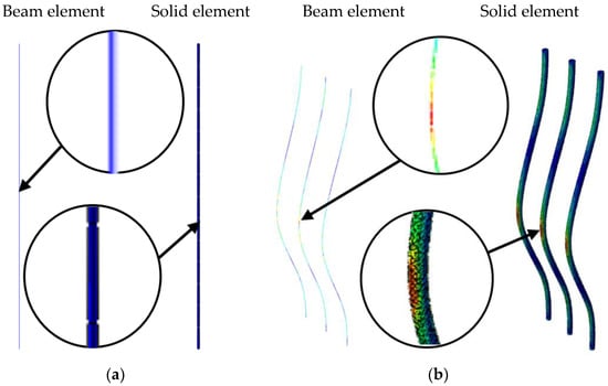 In the case of uniaxial tension, the stress fields were homogeneous, both for the case of beam elements, and when using solid elements. The discrepancy in the values of maximum stresses was 0.07%. For three-point bending, maximum stresses were observed at the points of load application, with a discrepancy in the values of maximum stresses of about 1.8%. Thus, the proposed approach employing beam elements provided sufficient calculation accuracy while significantly saving computational time.