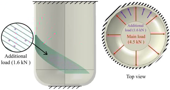 A maximum load of 4.5 kN (equivalent to the body weight of a 100 kg patient) was uniformly distributed across the entire prosthetic socket surface. This load represented the upper limit of stress that the prosthesis would experience under full weight of a patient. An internal pressure artificially created a zone of high stresses, simulating the uneven load transfer from a stump. To achieve this, an additional load was applied to a section of the socket, with the load value determined from the condition of crack initiation in the un-reinforced model. By iteratively increasing the load value, it was determined that a load of 1.6 kN led to failure of the socket.