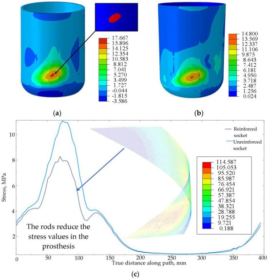 The analysis of the results of computations revealed that failure criteria were exclusively observed in the unreinforced prosthetic socket model under identical loading conditions (see Figure 11a). The unreinforced socket exhibited a maximum normal stress of 17.67 MPa in the direction of load application, surpassing the material’s strength limit. By contrast, the reinforced socket demonstrated a reduced maximum normal stress of 14.80 MPa (see Figure 11b). Thus, the presence of reinforcing rods reduced the stress in the prosthesis by 16.2%. This relationship is clearly illustrated in Figure 11c. The graph illustrates stress distribution curves along a circular path with a 61 mm diameter, which traverses the cross-section of the socket and intersects the centers of the reinforcing rods.