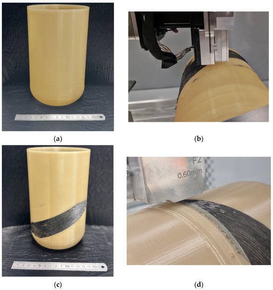 The stages of socket prototype manufacturing: (a) thin-walled 3D-printed PA12 cylinder; (b) deposition of the carbon rods according to the predetermined trajectories; (c) a socket prototype with applied carbon rods; (d) sealing of the rods and restoration of the wall thickness with additional layers of PA12.