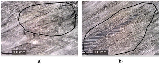 During the loading of the sample, the maximum stresses were localized in the deflection zone of the plate, leading to the initiation of cracks on the outer surface of the plate. The areas of matrix failure are highlighted in red (see Figure 3a). It can be observed that, in the unreinforced plate, the failure field was uniform; however, with the introduction of rods, the area of the polymer matrix exceeding critical stresses decreases.