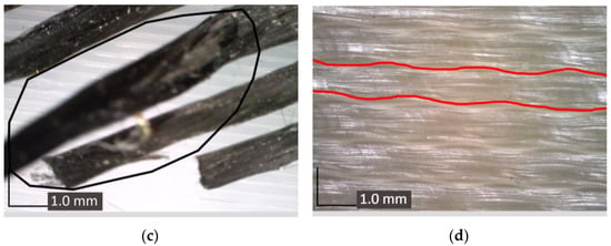 One of the most common problems in the reinforcement of 3D-printed parts is fiber breakage. This can occur due to incorrect printing parameters or fiber quality, leading to a decrease in the strength and stiffness of the finished product. The creation of the socket involved multiple stages (as detailed in Section 3.3). During the non-planar reinforcement of the prototype with individual carbon rods along the trajectories, the polymer rod experienced significant bending. This resulted in the rod being cut by the extruder nozzle (see Figure 13a,b). The second most common problem is fiber delamination, which can occur due to insufficient adhesion between the fiber and the polymer matrix (see Figure 13c).