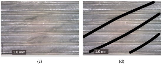 During this study, these aspects were carefully considered, leading to the creation of a prosthetic socket with a minimal number of defects (see Figure 14a–d). The extrusion speed of the carbon rods varied from 100 mm/min to 500 mm/min, and an optimal speed of 300 mm/min was chosen. The extruder temperature ranged from 265 °C to 300 °C. Temperatures below 265 °C resulted in low adhesion between the prototype and the carbon rod, negatively affecting the reinforcement strength. On the other hand, temperatures above 300 °C caused overheating of the thermoplastic binder, which could lead to its degradation and even burning. The optimal gap for reinforcing the socket with carbon rods of 0.4 mm in diameter was established to be 0.3 mm. This gap ensured effective reinforcement and minimized the risk of defects, such as fiber breakage or delamination from the matrix. This study’s results confirm the effectiveness of selecting optimal printing parameters to enhance the quality of prosthetic sockets.