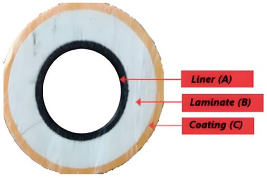 A melt-fused TCP was donated for the purpose of this research. The pipe has a 50 mm ID and a 102 mm OD with a length of 1500 mm and is stored at room temperature. Also, from the database, this is a glass fibre-reinforced high-density polyethylene (HDPE) TCP with a burst pressure of 5 ksi and an operating temperature of 65 °C. It is made of 3 fully bonded layers: the inner, the reinforced, and the outer. The thickness of the inner layer is 4 mm, while that of the reinforced and outer layers is 17 mm and 4 mm, respectively, with a total thickness of 25 mm, as displayed in Figure 1.