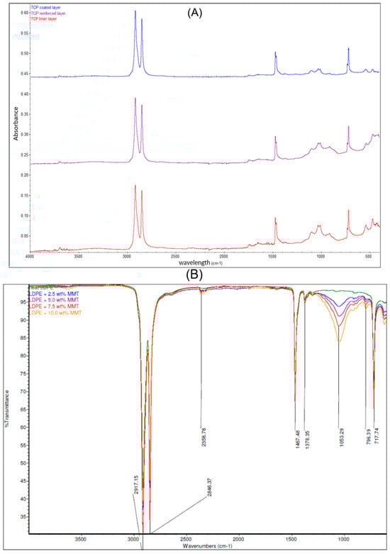 (A) ATR-FTIR spectra which indicate the composition of the liner, laminate, and coated layers. (B) Comparison of ATR-FTIR common scale spectra of LDPE and LDPE/MMT nanocomposites [12] and (C) the FTIR curves of pure HDPE and pure XLPE [14].