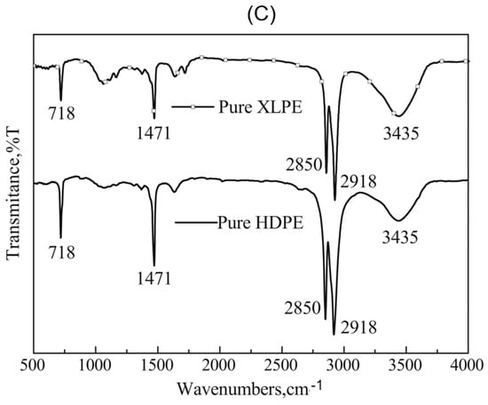 Each layer of the pipe was examined by FTIR spectroscopy attached to ATR to study the elements at the surface of the samples. The peak from the results provides detailed information on it, and the use of the library manager will also give a clue. In Figure 2A, the spectra of the inner layer sample are presented and show that it is a polyethylene functional group. From the studies of Maheswari et al. [13] and Mahmud [20], the slight absorption peak within 3500–3000 cm−1 indicates that this layer has little fibre and was treated to handle the conveyed fluid conditions. The peaks are four bands that are at the peaks of 2913.50 cm−1, 2846.66 cm−1, 1469.45 cm−1, and 716.64 cm−1. The absorbance peaks at 2913.50 cm−1 and 2846.66 cm−1 represent the presence of a stretch vibration C-H bond with strong absorption for heavy presence, at the 90% absorbance between the 2000 cm−1 and 2500 cm−1 indicating an attachment to a primary amine, while the 1469.45 cm−1 and 716.64 cm−1 signify a bending vibrating C-H and C-H cis functional group in medium absorptions, respectively. All this indicates an alkene group attached to a primary amine. Using the work performed by Siddique [12] on LDPE, this layer is of the ethene family but not LDPE (see Figure 2B). However, from the FTIR curves obtained by Hu et al. [14] in Figure 2C that studied the thermal properties of both high-density polyethylene (HDPE) and cross-linked high-density polyethylene (XLPE), this layer fits more to HDPE.