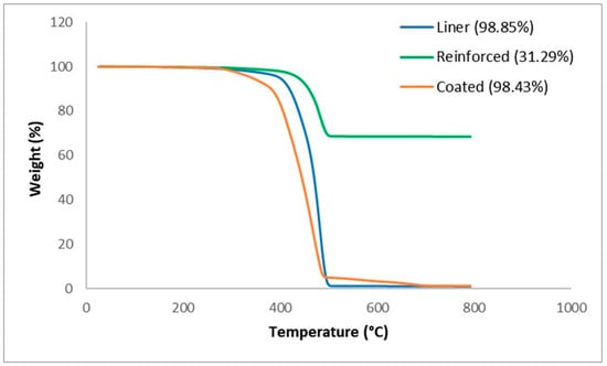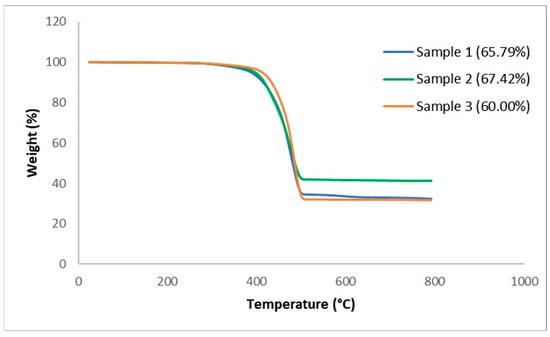 The thermograms reveal an almost similar process for both samples with only one major weight loss transition. Although the onset temperature of both samples is roughly 200 °C, most of the degradation seems to have occurred at the temperature range of 200–600 °C. From the final residue weight, it is noticed that the degraded portion differs, as that of sample 1 is 65.94%, sample 2 is 67.42%, and sample 3 is 60.00%. This is attributed to differences in mass for each layer in the full samples, with all indications that the glass fibre remains stable after roughly 625 °C. With these results, an attempt can be made to estimate the fibre volume fraction based on the resin burn-off technique from the fibre weight to composite weight ratio presented in Table 1. From Table 1, it can be stated that the fibre weight percent of the composite is within the range of 33–40%. To clarify this, Figure 3 shows the weight change for each layer of the TCP.
