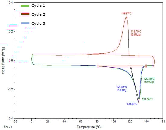 Furthermore, the enthalpies and temperatures of the cycles in the other DSC samples follow the same path and are within a similar range. To derive the degree of crystallinity of the samples, the melting temperature at cycle 1 is considered here, which is presented in Table 2 using the crystallinity equation as provided.