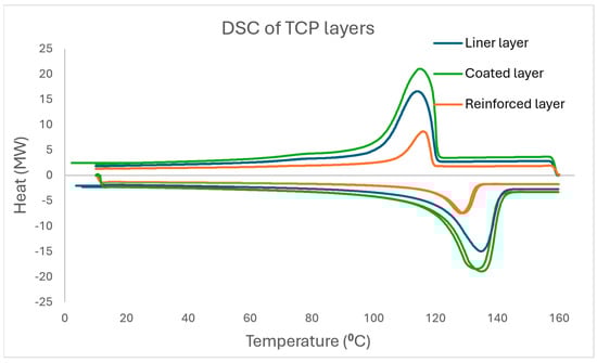 DSC thermogram displaying the glass transition temperature, melting temperature, and crystallisation temperature of the liner, reinforced, and coated layers at 10 °C/min.