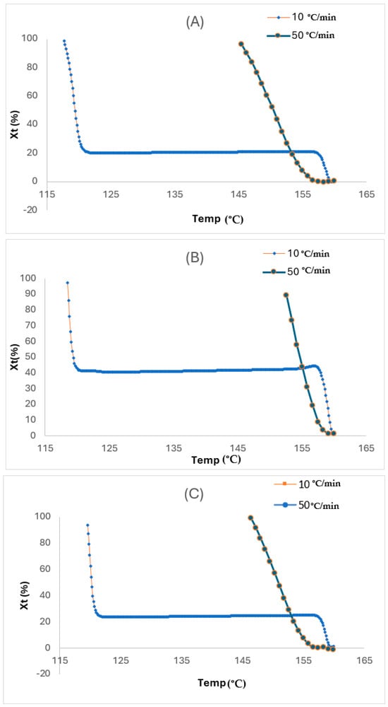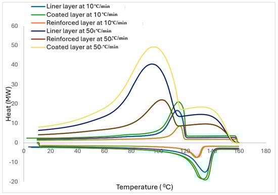 As previously stated, the fillers in polymers significantly influence the crystallisation behaviour of the reinforced polymer composite. The crystallisation process is carried out either in isothermal or non-isothermal conditions. However, due to the ease of theoretical analysis of results, the investigations of isothermal conditions are common. Practically, polymers and their composites are subjected to non-isothermal processes; hence, the non-isothermal crystallisation conditions are more useful. The DSC curves of the layers for the two cooling rates of 10 °C/min and 50 °C/min are displayed in Figure 7. The crystallinity curve for 50 °C/min is added from Figure 6.