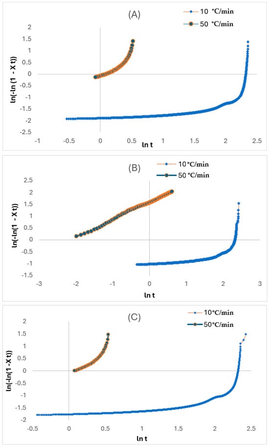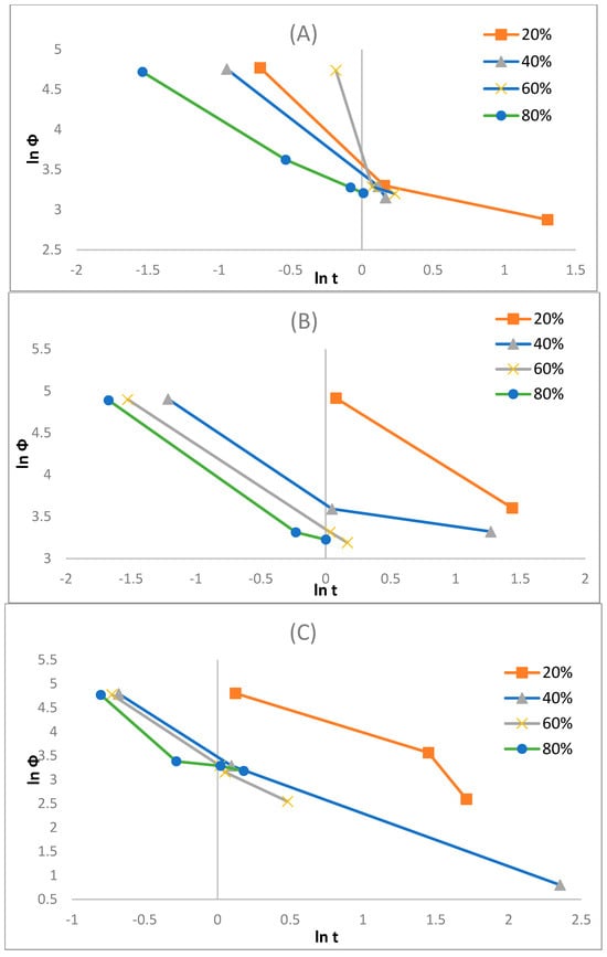 Here, represents the slope, and represents the cooling value selected at a specific crystallisation time when the process results in a certain degree of crystallinity, which is estimated by the intercept. With a reducing value, the crystallisation rate increases. Hence, has a distinct practical and physical connotation. The differences of ln () vs. ln (t) at specific relative degrees of crystallinity Xt, which here are at 20%, 40%, 60%, and 80% (see Figure 8A–C), for the different composite layers considered in this research are displayed in Figure 11A–C, and Table 6 summarises the parameters.