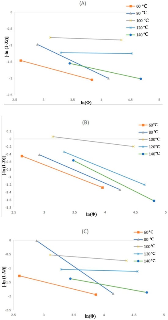 The Ozawa plots of ln [-ln (1-Xt)] vs. ln(Φ) for non-isothermal crystallisation of (A) liner, (B) reinforced, and (C) coating layers.