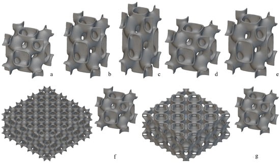 FRD TPMS lattice structures: (a) FRD222 base cell; (b) FRD223 base cell; (c) FRD224 base cell; (d) FRD333 base cell; (e) FRD334 base cell; (f) three-dimensional strucuture arragement for the FRD222 base cell; (g) three-dimensional strucuture arragement for the FRD333 base cell.