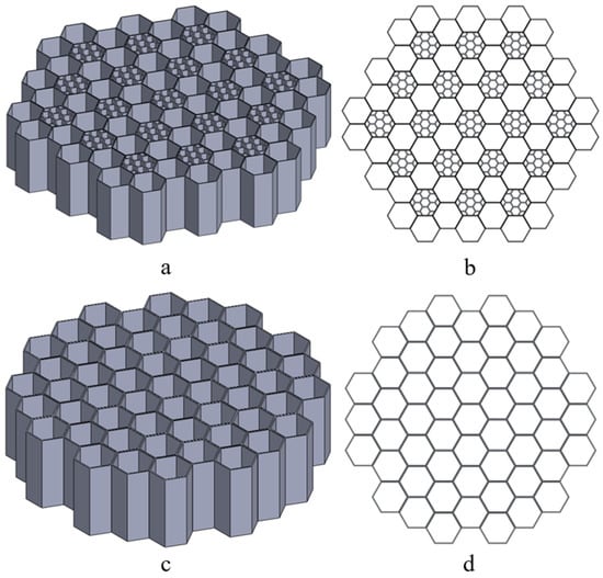 Pomelo peel-inspired honeycomb structure: (a) three-dimensional and (b) top-plane views of structure arrangement. Hexagonal structure: (c) three-dimensional and (d) top-plane views of structure arrangement.