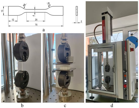 (a) Standard ISO 527-2:2012 [41] uniaxial tensile specimen with specific dimensions in millimetres, (b) standard uniaxial monotonic quasi-static tensile test set-up, (c) compression test set-up and (d) STEP Lab EA05 testing machine.