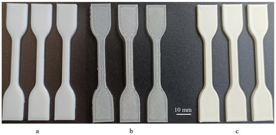Standard ISO 527/2-5A specimens 3D-printed using (a) TPC, (b) PEBA and (c) TPU for tensile strength tests.