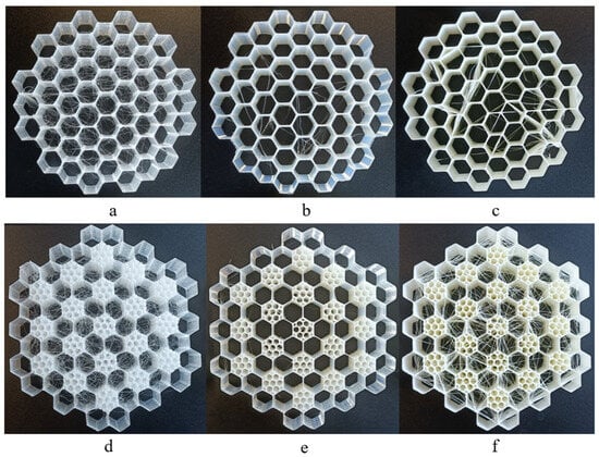 Honeycomb structures of HEX 3D-printed using (a) PEBA, (b) TPC and (c) TPU and HEX-Pomelo structure inspired by pomelo peel 3D-printed using (d) PEBA, (e) TPC and (f) TPU.