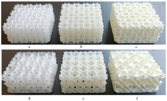 TPMS FRD222 structure 3D-printed using (a) PEBA, (b) TPC and (c) TPU and TPMS FRD333 structure 3D-printed using (d) PEBA, (e) TPC and (f) TPU.