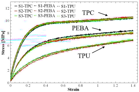 Figure 7 shows the monotonic stress–strain curves obtained for the three standard specimens printed for each material. The tests were conducted under uniaxial quasi-static tensile loading, with a data acquisition rate of 4 kHz. Overall, the three curves for each material perfectly overlapped, which indicates excellent reproducibility of the tests. It is also clear that the curves extend up to a strain of 1.4. This value corresponds to the maximum distance allowed by the grip system of the testing apparatus. Thus, it was not possible to calculate the maximum elongation or rupture strain because the displacement range was not sufficient.